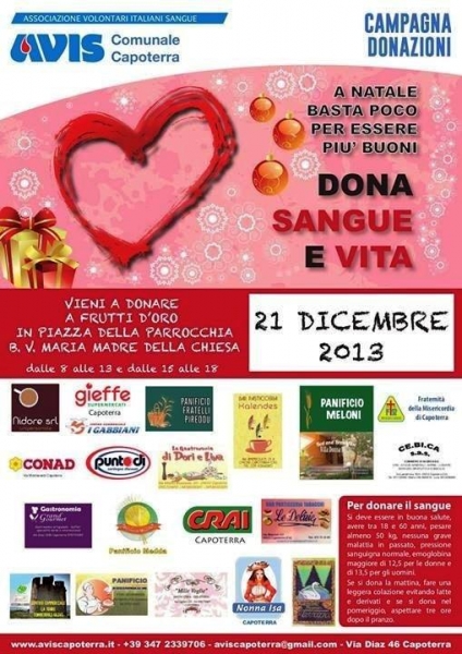 Sabato 21 dicembre nuovo appuntamento con l'Avis di Capoterra. Solidarietà e concretezza in un unico gesto: donare il sangue per la vita. La raccolta sarà attiva nel piazzale di Parrocchia Beata Vergine Maria Madre della Chiesa di Frutti d'oro dalle ore 8 alle 13 e dalle 15 alle 18. "Basta un piccolo gesto per regalare tanti sorrisi, spesso Donare arrichisce più' di quando si riceve!"con queste parole il presidente dell'Avis Capoterra Marco Mameli incoraggia alla partecipazione di una giornata importante per tutta la comunità .
