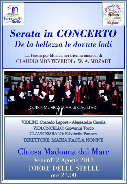 Il coro MUSICA VIVA CAGLIARI  si esibirà in concerto venerdì 2 agosto alle 22 nella Chiesa Madonna del Mare a Torre delle Stelle.Il direttore Maria Paola Nonne e il suo coro canteranno "la Poesia per la musica nei tricinia amorosi di C.Monteverdi e W.A.Mozart.Saranno accompagnati dagli strumenti di Corrado Lepore e Alessandra Casula ai violini,Giovanni Tocco al violoncello, Elisabetta Panzan al clavicembalo.