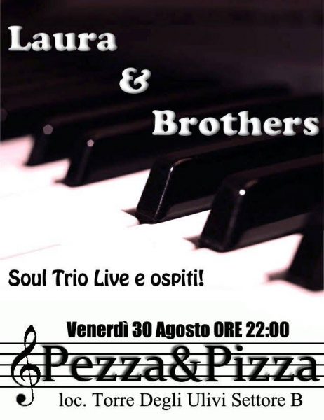 Venerdì 30 agosto alle ore 22 serata con Laura and Brothers nella pizzeria di Torre degli Ulivi Pezza e Pizza . Il trio acustico formato da Laura Lai alla voce,e i fratelli Zucca Alessandro alla Chitarra e Andrea al piano, si è costituito sei anni fa, e dopo due anni di silenzio artistico, torna con una serata all’insegna del pop rock soul adattato in chiave acustica. Dopo tanta attesa vale la pena andare a sentirli!!