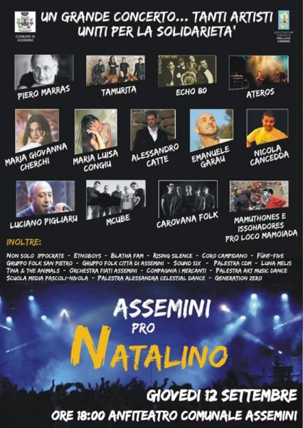 Da quel momento è nata l’idea di Assemini Pro Natalino, un gruppo di amici e concittadini hanno messo a disposizione della causa tempo, energie e idee. E quale miglior collante e attrattiva della musica? L’anfiteatro ospiterà artisti del calibro di Piero Marras, Tamurita, Eco 80, Alessandro Catte, due gruppi della ProLoco di Mamoiada, i Non Solo Ippocrate, il gruppo musicale dei medici, e tantissimi altri artisti, con la divertentissima collaborazione dei La Pola. In tantissimi si sono proposti per contribuire alla performance, una risposta di solidarietà che ha fornito una vastissima scelta agli organizzatori.