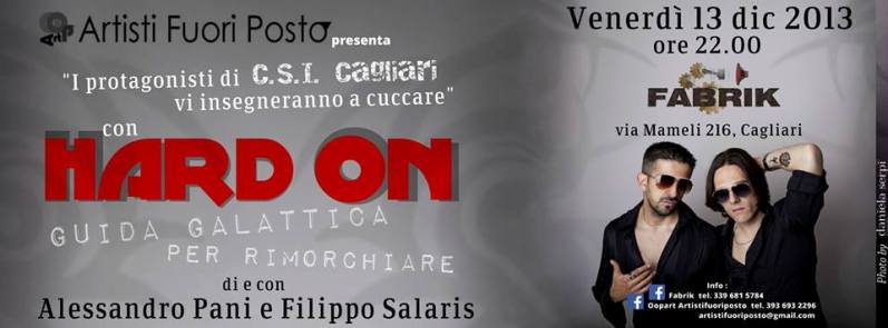 Venerdì 13 dicembre alle ore 22 al Fabrik di Via Mameli l’ultima divertentissima idea dei due attori protagonisti di Csi Cagliari,Alessandro Pani e Filippo Salaris che questa volta si cimenteranno in una performance di tipo istruttivo- sociale: insegnare al pubblico maschile come “rimorchiare” le ragazze.