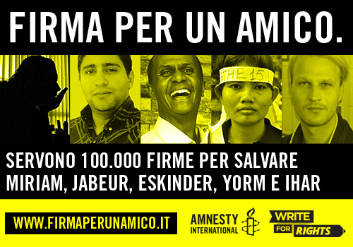 “Immagina che un tuo amico venga imprigionato, che subisca violenza per aver fatto qualcosa di assolutamente comune, solo per aver preteso i suoi diritti. Cosa faresti per salvarlo?” È questo il messaggio che Amnesty International porterà nelle piazze italiane e sul sito www.firmaperunamico.it, invitando chiunque abbia a cuore i diritti umani a firmare gli appelli proprio come se lo si stesse facendo per un’amica imprigionata ingiustamente, per un amico gay o per un familiare ‘colpevole’ di aver espresso senza paura le proprie critiche al Governo o la propria opinione.