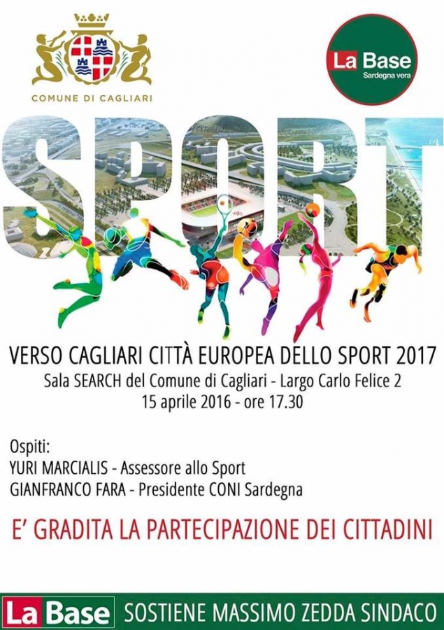 La candidatura di Cagliari a città europea dello sport 2017 (e soprattutto i suoi vantaggi, in termini economici e culturali) sarà al centro del dibattitto che questa sera il movimento La Base di Cagliari organizza al Search, il sottopiano del Municipio nel Largo Carlo Felice. A partire dalle 17.30 al tavolo coordinato da Claudio Cugusi e Roberto Cherchi, prenderanno la parola l'assessore comunale allo Sport, Yuri Marcialis e il presidente del Comi Sardegna, Gianfranco Fara.