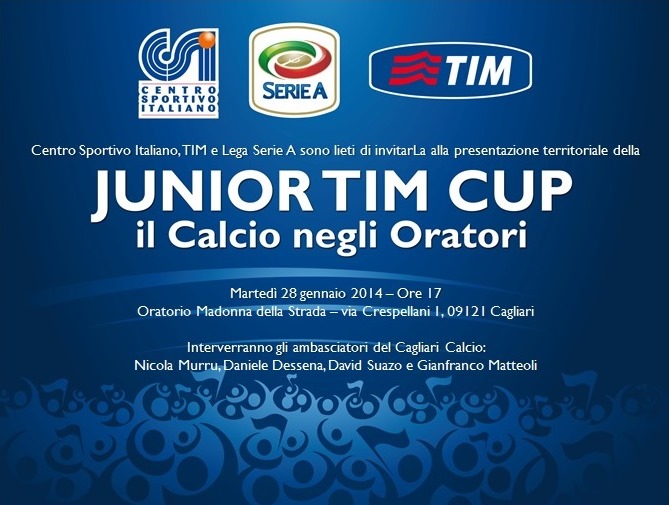 Questo pomeriggio si terrà la presentazione della JUNIOR TIM CUP - Il Calcio negli Oratori” alle ore 17, all’Oratorio Madonna della Strada, via Crespellani 1, 09121 Cagliari.