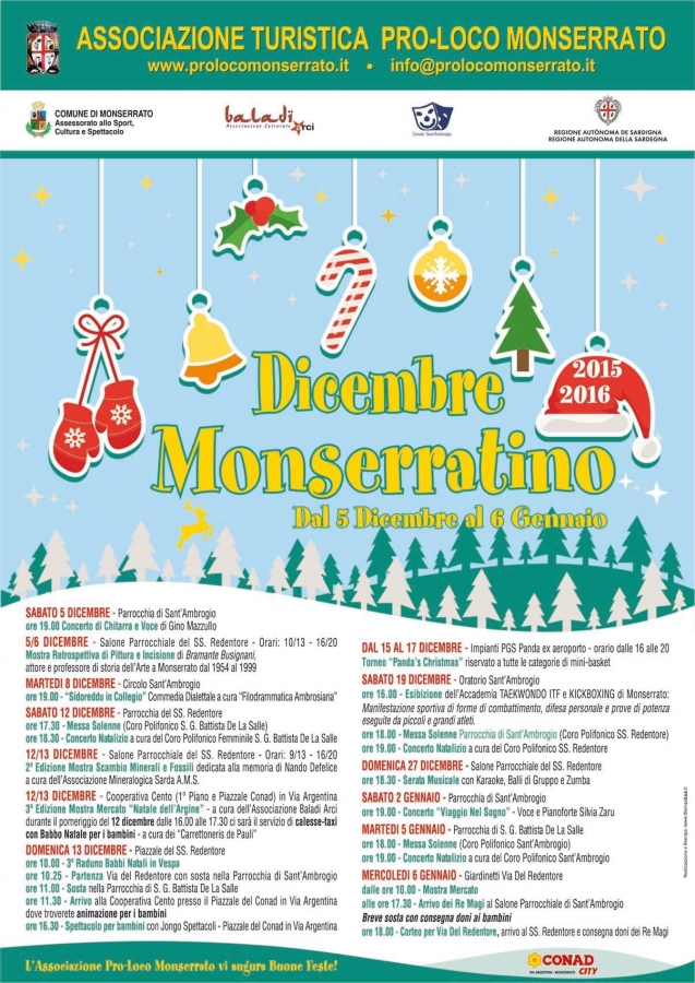 Le manifestazioni proseguiranno con appuntamenti quasi quotidiani. In scena l'8 dicembre la Filodrammatica Ambosiana, impegnata in questi mesi nella raccolta di fondi da dedicare al restauro dell'organo della Chiesa di Sant'Ambrogio. A seguire il 12 e 13 ci saranno la mostra di minerali e fossili allestita presso il salone parrocchiale del Redentore dedicata a Nando de Felice e la mostra mercato in via Argentina curata dall'associazione Baladi Arci in cui sarà possibile per i bambini usufruire del servizio taxi di Babbo Natale a cura dei Carrettonerisi de Pauli. La mattina del 13 dicembre il tradizionale Raduno dei Babbi Natale in vespa animerà le vie del centro e terminerà alle 11.30 in via Argentina dove ci sarà l'animazione per i bambini. La novità importante di questa edizione è l'inserimento nel cartellone dal 15 al 17 dicembre del torneo Panda's Christmas per le categorie del mini basket che la società sportiva Panda Basket organizza ogni anno, e della esibizione il 19 dicembre dell'Accademia di Taekwondo e KickBoxing di Monserrato. Il 12 e il 19 dicembre, e il 5 gennaio i tre cori cittadini Parrocchiali si esibiranno nelle tre Parrocchie con i Concerti Natalizi. Il 27 dicembre è prevista una serata di animazione con Karaoke e balli di gruppo presso il salone parrocchiale del Redentore. A gennaio due importanti appuntamenti, il 2 con la cantante e pianista Silvia Zaru che si esibirà ospite della parrocchia di Sant'Ambrogio e L'epifania che chiuderà le manife festeggiata con il tradizionale appuntamento dell'arrivo dei Magi che partiranno dall'oratorio di Sant'Ambrogio per raggiungere la Parrocchia del SS. Redentore dove distribuiranno i loro Doni.